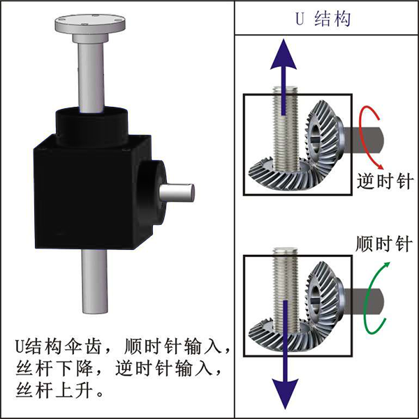 结构:螺旋伞齿轮结构,安全自锁;